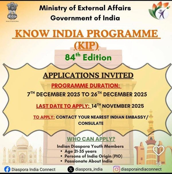 Know India Programme (KIP) is a flagship programme of this Ministry of External Affairs (MEA) that seeks to reconnect PIOs in the age-group of 21-35 years to their ethnic roots besides showcasing the rich cultural heritage of India and its recent spectacular developmental efforts. Ministry endeavors to present various facets of contemporary Indian Art, Heritage, Culture, Economy, Innovations, Start-ups, Science & Technology, etc., to the youth members of the Indian Diaspora and strives to motivate and inspire them to contribute and participate in the transformative initiatives of the Government of India as part of its march towards Viksit Bharat.